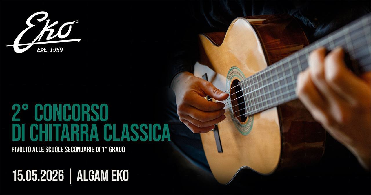 Eko Guitars è lieta di annunciare la seconda edizione del "Concorso di Chitarra Classica 2026", che si terrà il giorno 15 maggio 2026 presso la sede di Algam EKO a Montelupone (MC). Il concorso è rivolto a tutte le Scuole Secondarie di I° grado. Cosa aspetti? Scarica il regolamento e invia la tua candidatura per poter partecipare!